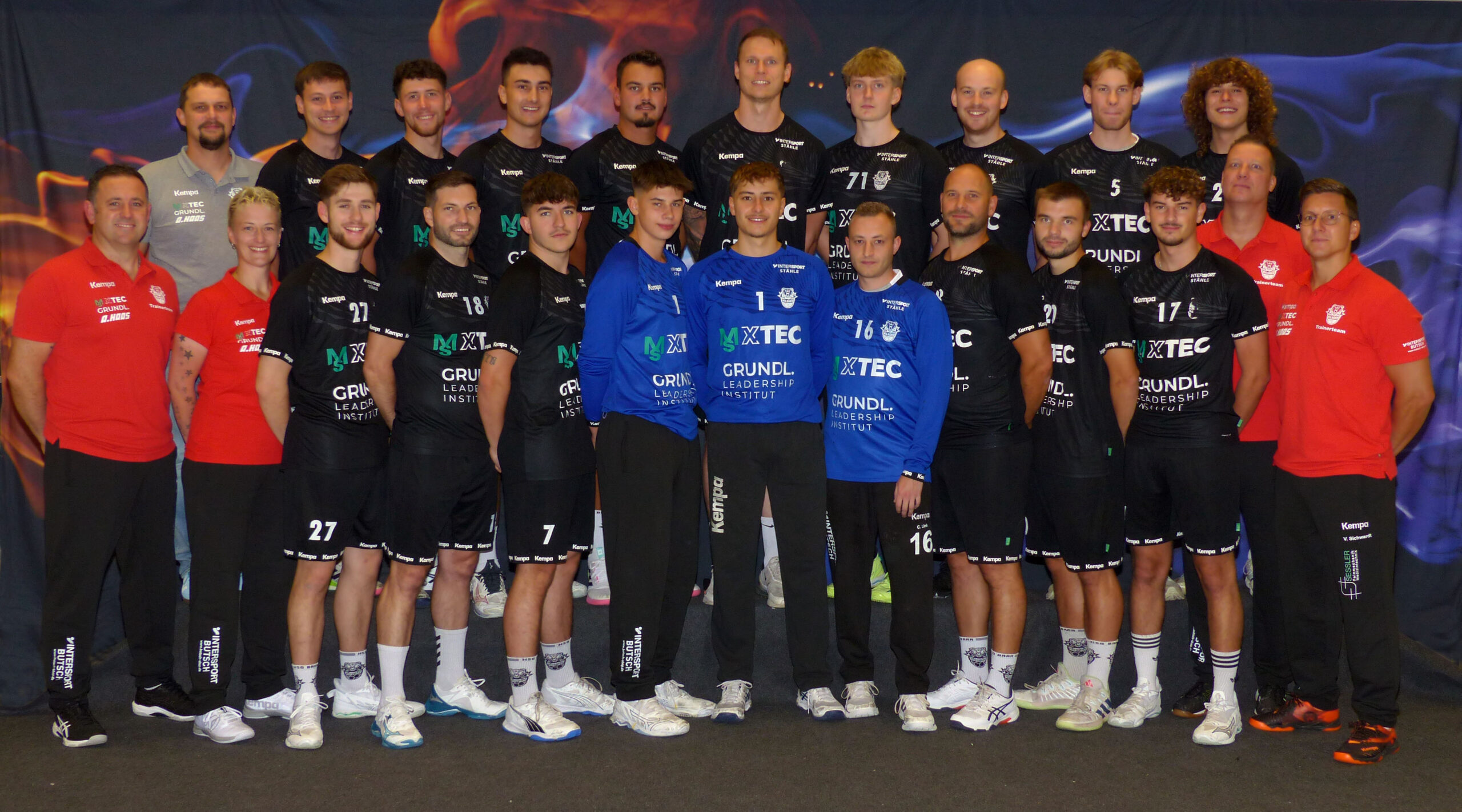 Vorne von links: Manuel Schmelovski (Trainer), Eva Kull (Athletik/Physio), Patrick Bast, Till Oeschger, Leon Irion, Lukas Wölfl, Noah Kreutter, Christoph Link, Manuel Arts, Benni Mauthe, Jonas Kreutter, Stefan Volz (TW-Trainer), Viktor Sichwardt (Co-Trainer)