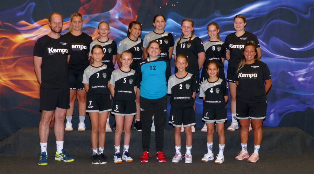 Vorne von links: David Schmidt (Trainer), Adelina Keller, Ksenia Wasinger, Olivia Piontek, Jule Rapp, Elisa Gola, Alexandra Keller (Co-Trainerin)